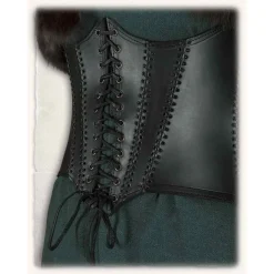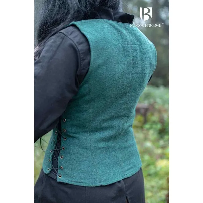 Dit dames vest is gebaseerd op 17de eeuwse afbeeldingen. Het vest kan goed worden gedragen in combinatie met 17de eeuwse kledij of bij fantasy en steampunk outfits. Aan de zijkant heeft dit vest koorden waarmee hij op maat kan worden versteld.