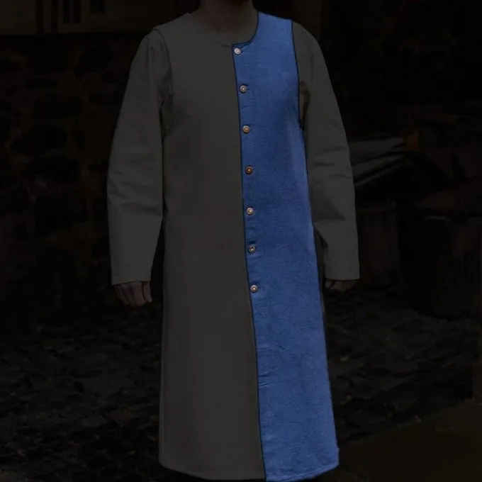 Ontdek de nieuwe Mi Parti collectie van Burgschneider! De tabberd Auderic bestaat uit twee helften die los worden verkocht. Zo kan je naar wens een mi parti tabberd samenstellen. De linkerkant maak je vast aan de rechterkant met de knopen. Als je in verschillende middeleeuwse LARP en reenactment groepen zit, kan je dus met een paar linker en rechterkanten heel veel verschillende kleurcombinaties maken. De tabberd is een kledingstuk, dat al in de 12e eeuw terug te vinden was. Het werd gedragen boven de andere kleding, met veel heraldiek en decoratieve elementen. Het werd gedragen door bijvoorbeeld een heraut zodat men kon zien wat de heraldiek was. Je kan een tabberd ook dragen als surcoat. Deze tabberd is gemaakt van een zwaar katoen met een diepe kleur, geschikt voor alle weersomstandigheden. Van de 11e tot de 16e eeuw was de “mi-parti” (gedeeltelijk gekleurde) kledingstijl populair, waarbij twee verschillende gekleurde stoffen in het midden met elkaar werden verbonden. Het effect is een kleurcontrast dat vaak voor een dramatische look zorgt. In de Middeleeuwen was Mi-parti een belangrijke stijl onder mantels, tabberds, jurken, broeken en jurken. De vroegste voorbeelden van deze stijl dateren uit de 9e en 10e eeuw, waar de gesplitste kleuren werden gebruikt op benen en schoenen. De laarzen waren bijvoorbeeld voor de helft de ene kleur en de andere helft de andere kleur. In de hoge middeleeuwen groeide de mi parti-stijl in populariteit naarmate kleursymboliek in kleding belangrijker werd. De kleuren stonden vaak voor een bepaalde status of een bepaalde verbondenheid. De stijl werd gebruikelijker in de 13e en 14e eeuw toen veel mannen, vooral vazallen, de wapenschilden van hun leenheren imiteerden. Tegen het einde van de 16e eeuw nam de stijl geleidelijk af.