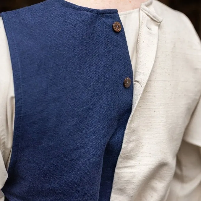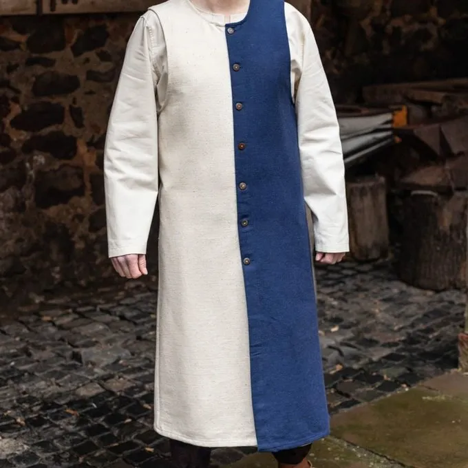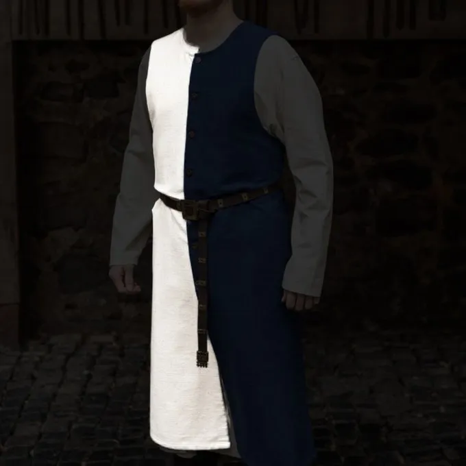 Ontdek de nieuwe Mi Parti collectie van Burgschneider! De tabberd Auderic bestaat uit twee helften die los worden verkocht. Zo kan je naar wens een mi parti tabberd samenstellen. De linkerkant maak je vast aan de rechterkant met de knopen. Als je in verschillende middeleeuwse LARP en reenactment groepen zit, kan je dus met een paar linker en rechterkanten heel veel verschillende kleurcombinaties maken. De tabberd is een kledingstuk, dat al in de 12e eeuw terug te vinden was. Het werd gedragen boven de andere kleding, met veel heraldiek en decoratieve elementen. Het werd gedragen door bijvoorbeeld een heraut zodat men kon zien wat de heraldiek was. Je kan een tabberd ook dragen als surcoat. Deze tabberd is gemaakt van een zwaar katoen met een diepe kleur, geschikt voor alle weersomstandigheden. Van de 11e tot de 16e eeuw was de “mi-parti” (gedeeltelijk gekleurde) kledingstijl populair, waarbij twee verschillende gekleurde stoffen in het midden met elkaar werden verbonden. Het effect is een kleurcontrast dat vaak voor een dramatische look zorgt. In de Middeleeuwen was Mi-parti een belangrijke stijl onder mantels, tabberds, jurken, broeken en jurken. De vroegste voorbeelden van deze stijl dateren uit de 9e en 10e eeuw, waar de gesplitste kleuren werden gebruikt op benen en schoenen. De laarzen waren bijvoorbeeld voor de helft de ene kleur en de andere helft de andere kleur. In de hoge middeleeuwen groeide de mi parti-stijl in populariteit naarmate kleursymboliek in kleding belangrijker werd. De kleuren stonden vaak voor een bepaalde status of een bepaalde verbondenheid. De stijl werd gebruikelijker in de 13e en 14e eeuw toen veel mannen, vooral vazallen, de wapenschilden van hun leenheren imiteerden. Tegen het einde van de 16e eeuw nam de stijl geleidelijk af.