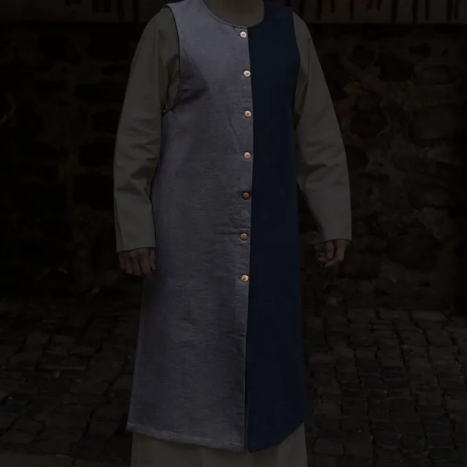 Ontdek de nieuwe Mi Parti collectie van Burgschneider! De tabberd Auderic bestaat uit twee helften die los worden verkocht. Zo kan je naar wens een mi parti tabberd samenstellen. De linkerkant maak je vast aan de rechterkant met de knopen. Als je in verschillende middeleeuwse LARP en reenactment groepen zit, kan je dus met een paar linker en rechterkanten heel veel verschillende kleurcombinaties maken. De tabberd is een kledingstuk, dat al in de 12e eeuw terug te vinden was. Het werd gedragen boven de andere kleding, met veel heraldiek en decoratieve elementen. Het werd gedragen door bijvoorbeeld een heraut zodat men kon zien wat de heraldiek was. Je kan een tabberd ook dragen als surcoat. Deze tabberd is gemaakt van een zwaar katoen met een diepe kleur, geschikt voor alle weersomstandigheden. Van de 11e tot de 16e eeuw was de “mi-parti” (gedeeltelijk gekleurde) kledingstijl populair, waarbij twee verschillende gekleurde stoffen in het midden met elkaar werden verbonden. Het effect is een kleurcontrast dat vaak voor een dramatische look zorgt. In de Middeleeuwen was Mi-parti een belangrijke stijl onder mantels, tabberds, jurken, broeken en jurken. De vroegste voorbeelden van deze stijl dateren uit de 9e en 10e eeuw, waar de gesplitste kleuren werden gebruikt op benen en schoenen. De laarzen waren bijvoorbeeld voor de helft de ene kleur en de andere helft de andere kleur. In de hoge middeleeuwen groeide de mi parti-stijl in populariteit naarmate kleursymboliek in kleding belangrijker werd. De kleuren stonden vaak voor een bepaalde status of een bepaalde verbondenheid. De stijl werd gebruikelijker in de 13e en 14e eeuw toen veel mannen, vooral vazallen, de wapenschilden van hun leenheren imiteerden. Tegen het einde van de 16e eeuw nam de stijl geleidelijk af.