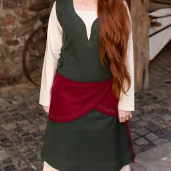 Deze omslagriem is gemaakt van wol en kan gedragen worden als een schort. Aan de uiteinden heeft bij stoffen koorden zodat je hem naar wens om je middel kunt draperen. De onderkant is rijkelijk versierd met een decoratief knoopmotief gemaakt van imitatie gouddraad. Deze stoffen riem geeft extra allure aan je re-enactment of Larp outfit.