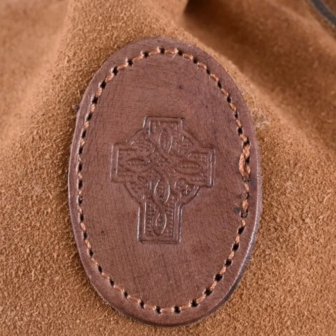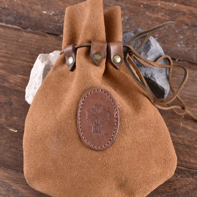 Een vrij grote leren buidel van soepel nappalaar, gedecoreerd met een Keltisch kruis. Al vanaf de Oudheid gebruikte men buidels om kostbaarheden zoals munten in op te bergen. Deze buidel heeft leren koordjes waarmee je hem kunt sluiten, en aan de riem kunt hangen. Een prachtige buidel bij je re-enactment of LARP outfit, en om je spullen in te bewaren tijdens evenementen en festivals.