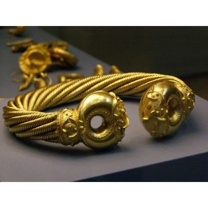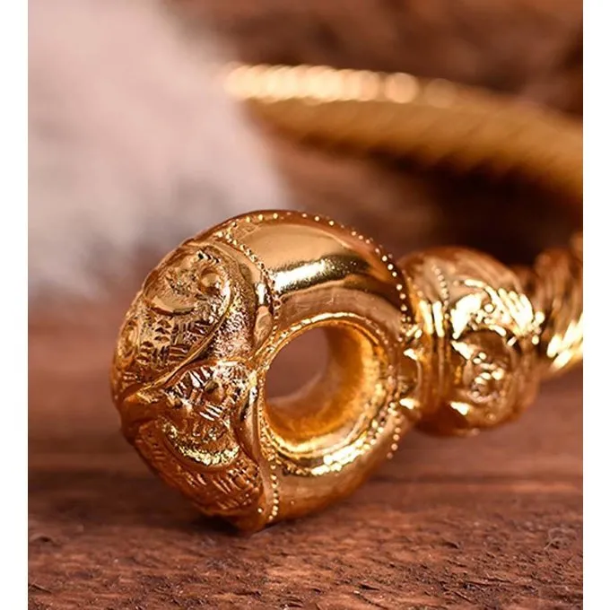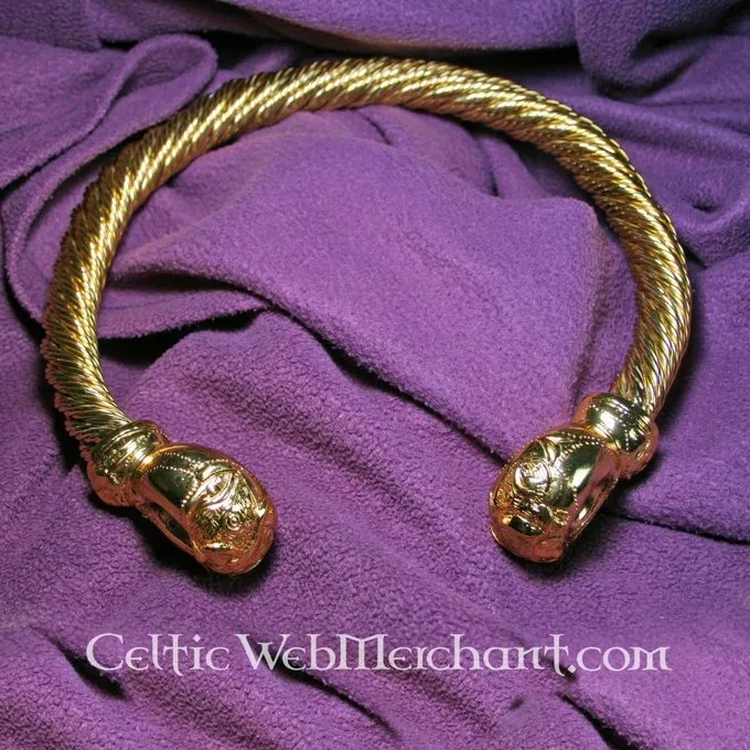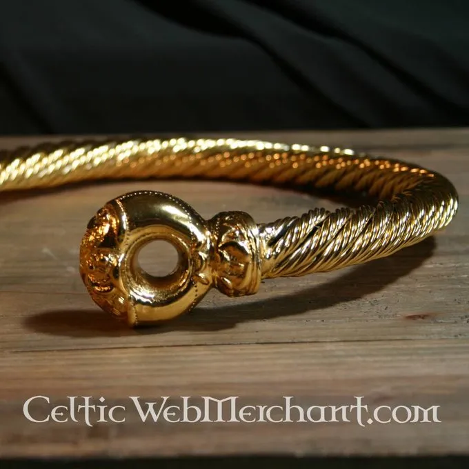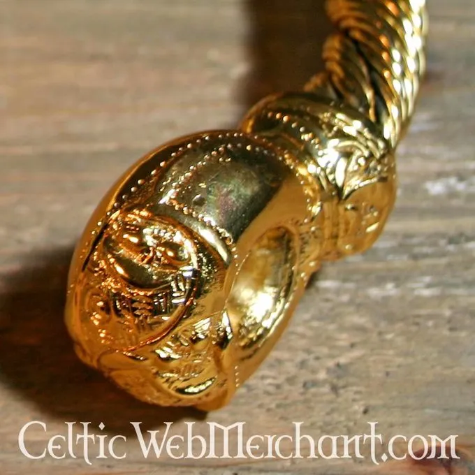 Deze torque is geheel handgemaakt en gedraaid en is tot in de details gereproduceerd. Hij is gemaakt van messing dat met bladgoud is overtrokken. Hij weegt 1,2 kg en heeft een breedte van 23 cm.