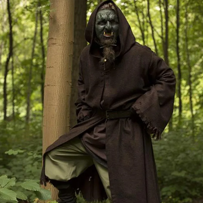 Gewaden werden van oudsher gedragen in religieuze settings, bijvoorbeeld door monniken en priesters. In de traditionele fantasyliteratuur is dit het kledingstuk geworden van magische personages. Dit gewaad is ontworpen om er versleten en gerafeld uit te zien. Hij is gemaakt van getextureerd katoen, wat er uitziet als een ruwe jute achtige stof, en is gerafeld aan alle randen. Als je een ork, trol of een ander monster of verschoppeling LARPt, is dit een perfect kledingstuk om over je kostuum te dragen. Door de ruwe afwerking en de kap die je over het hoofd kan dragen, geeft het gewaad je een griezelige en kwaadaardige uitstraling. Hierdoor is hij ook uitermate geschikt voor Halloween en theater. De mantel is geschikt om buiten te dragen in alle seizoenen en beschermt tegen de regen en kou. Je kunt het gewaad vastmaken bij de nek met een leren veter en een leren strip.