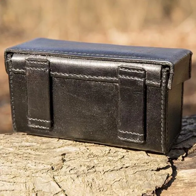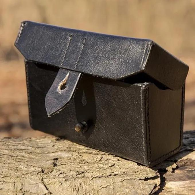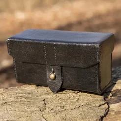 Deze rechthoekige leren doos kan je aan je riem hangen met grote riemlussen aan de achterkant. Hij is geschikt voor vrijwel alle riembreedtes. Deze doos heeft een prachtig authentiek uiterlijk vanwege de oude afwerking van het leer en de messingen drukknoppen. Hij is perfect voor militair re-enactment van middeleeuwen tot Napoleontisch en voor bijvoorbeeld handelaars en reizigers. Ook voor LARP en Cosplay is dit een prachtig accessoire voor het compleet maken van je kostuum.
