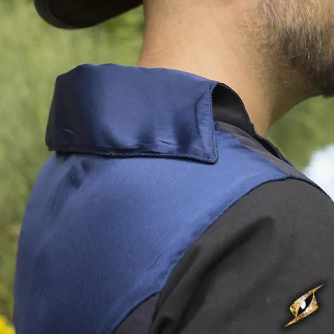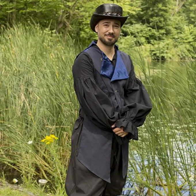 Dit prachtige asymmetrische vest is perfect voor negentiende eeuws re-enactment, LARP en steampunk. Hij is gemaakt in Victoriaanse stijl en makkelijk te combineren met een hemd of jurk om je outfit extra allure te geven. De bovenkant heeft een rij van vier knopen. Je kunt ervoor kiezen om alle knopen te sluiten, of om de kraag open te slaan. De kraag heeft een blauwe satijnen binnenvoering dus opengeslagen is deze mooi zichtbaar. De achterkant heeft ook een blauwe satijnen voering. Dit vest benadrukt de taille en loopt tot de knieën. De voorkant is langer dan de achterkant, wat een speels en mooi asymmetrisch effect geeft.