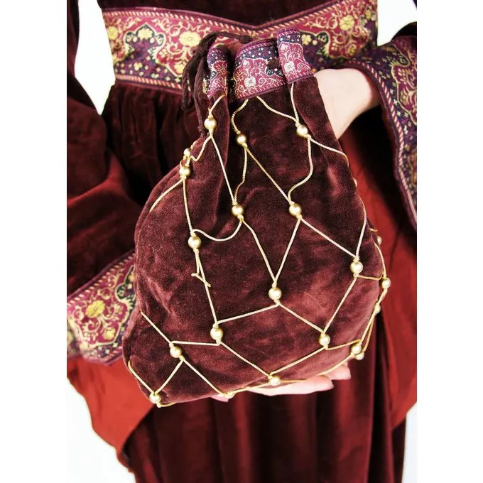 Deze luxe buidel kan worden gebruikt voor Middeleeuwse en Renaissance re-enactment. Hij maakt de outfit compleet van een rijke koopvrouw, een edelvrouw, aristocrate of een koningin. De fluweelachtige stof van de buidel is gedecoreerd met een patroon van imitatie gouddraad en imitatieparels. Hij wordt afgemaakt door het uitbundig versierde bovenrandje, dat doet denken aan een luxe wandtapijt dat in de woning van een adellijke figuur had kunnen hangen.