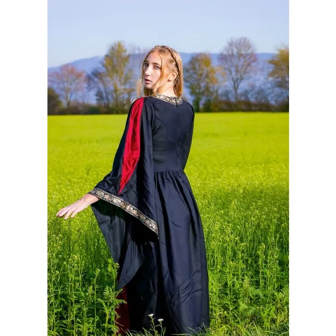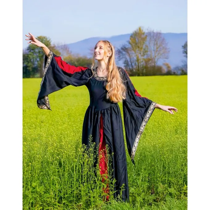 Deze Middeleeuwse jurk heeft luxe trompetmouwen en is afgezet met borduursels. Deze elegante jurk maakt jouw de prinses van het aankomende festivalseizoen. De jurk is goed te combineren met eventueel een onderjurk, riemen en verschillende accessoires.
