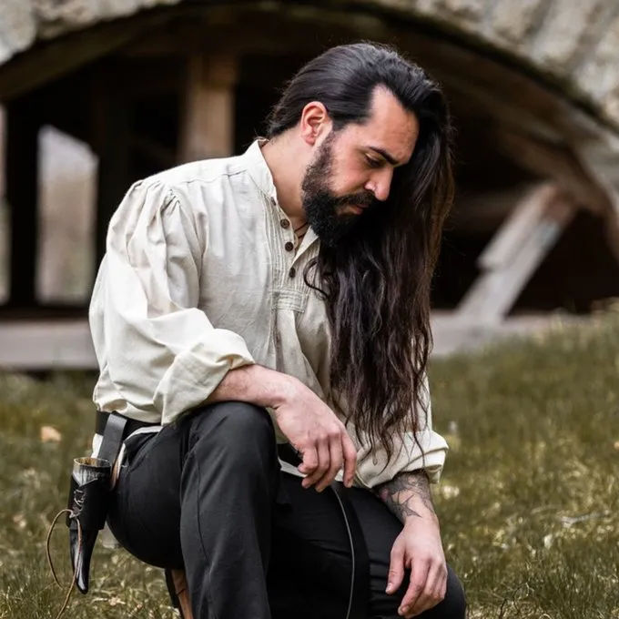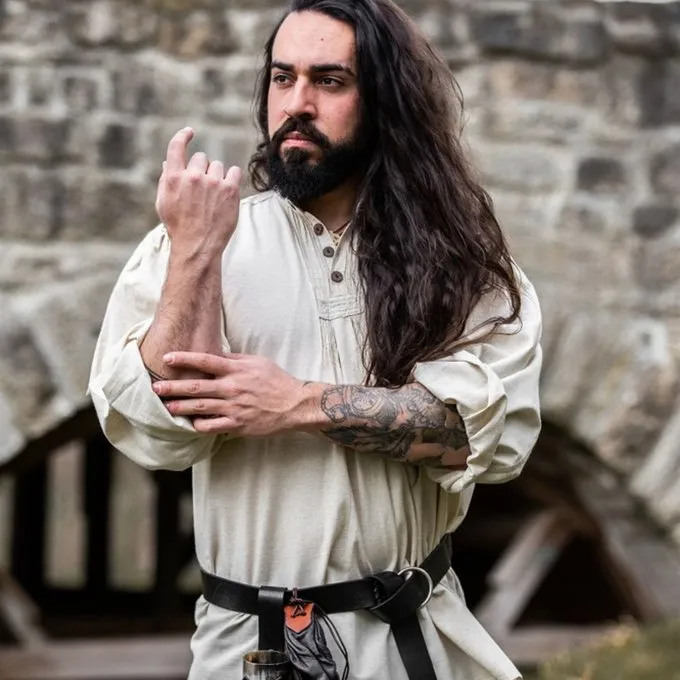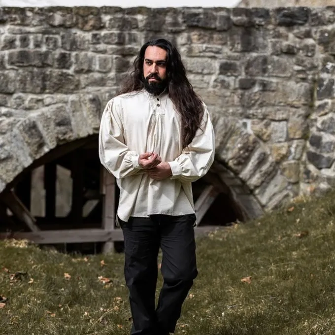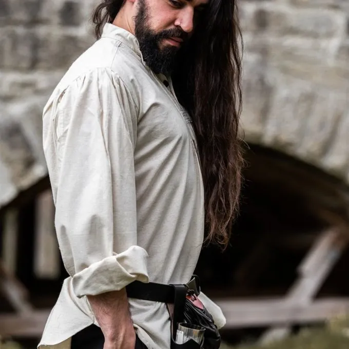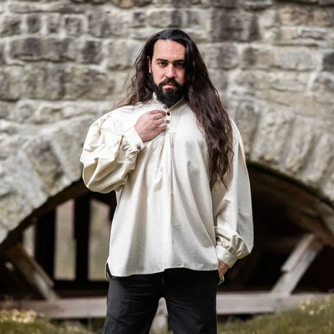 Dit hemd is aan de hals dicht te maken met houten knoopjes. Hij is verkrijgbaar in het wit, crème, zwart en rood in maat S t/m XXXL, kijkt u hiervoor naar de keuzemenu`s onderaan. De crèmeversie is gemaakt van een katoen-linnenmix, de overige versies van puur katoen.