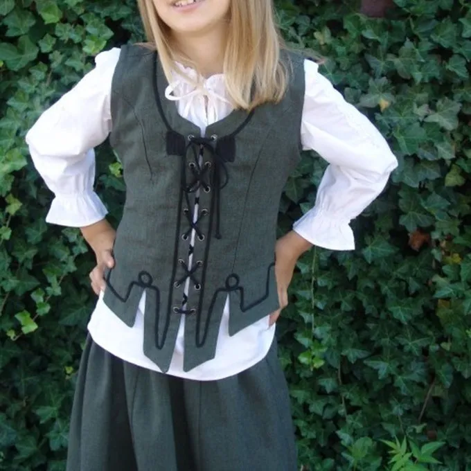 Dit mouwloze jackje is gemaakt van katoen. Hij is aan de voorkant dicht te rijgen met een koord en aan de achterkant op maat te stellen met een veter. Het jackje is verkrijgbaar in de kleuren groen en rood in maat XXXS t/m XS.