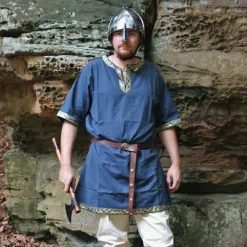 Deze lange tuniek met korte mouwen heeft elegante borduursels die gebaseerd zijn op middeleeuwse patronen in gouddraad.