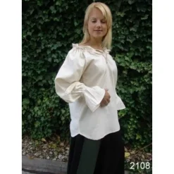 Deze top heeft lange mouwen. Rond de pols en de hals zit elastiek. De hals is dicht te maken met twee koordjes. Verkrijgbaar in wit (crème) en zwart in maat S t/m XXXL.