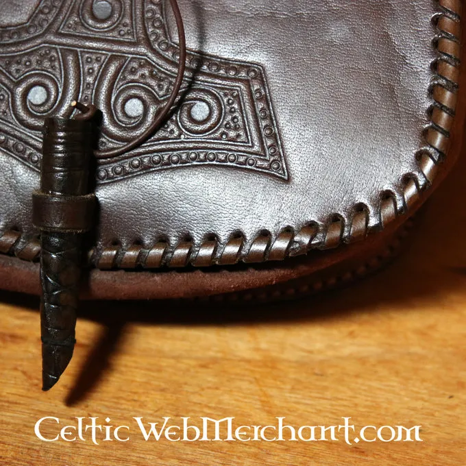 Dit tasje is prachtig gedecoreerd met Mjolnir, de Thorshamer. De zijkanten van de flap zijn gedecoreerd met honingkleurig garen. Met de twee lussen kan de tas aan een riem worden gehangen en hij kan aan de voorkant worden gesloten met een stuk gedraaid leer.