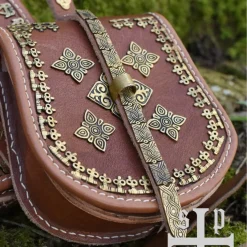 Deze tas is gebaseerd op verschillende middeleeuwse originelen. Tassen zoals deze werden regelmatig in middeleeuwse visuele kunst afgebeeld, vaak werden ze gedragen door pelgrims, maar in praktijk hadden de meeste mensen wel een textielen schoudertas liggen. Tassen zoals deze werden ook al in de vroege middeleeuwen gedragen zoals het vergelijkbare model teruggevonden in de Vikingstad Haithabu. Deze tas heeft net als het origineel een houten sluiting die is ingewerkt in de tas. De tas is voorzien van een koord van 5 mm dik en 160 cm lang waarmee hij om de schouder kan worden gedragen.