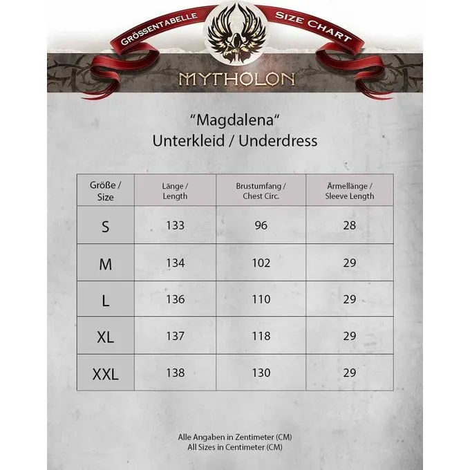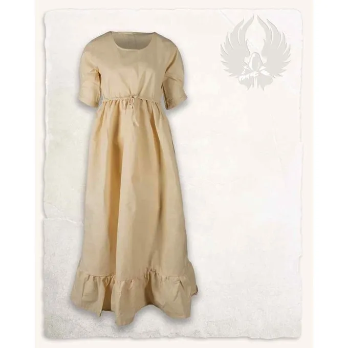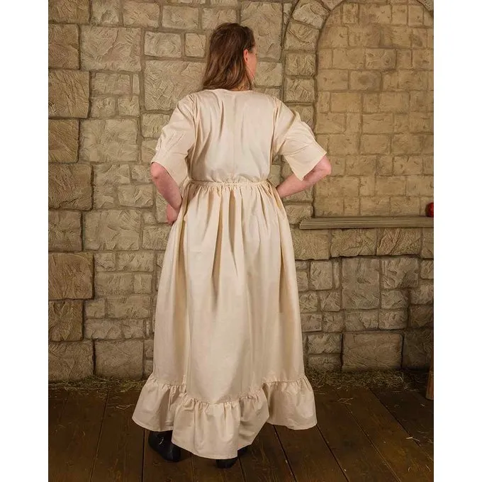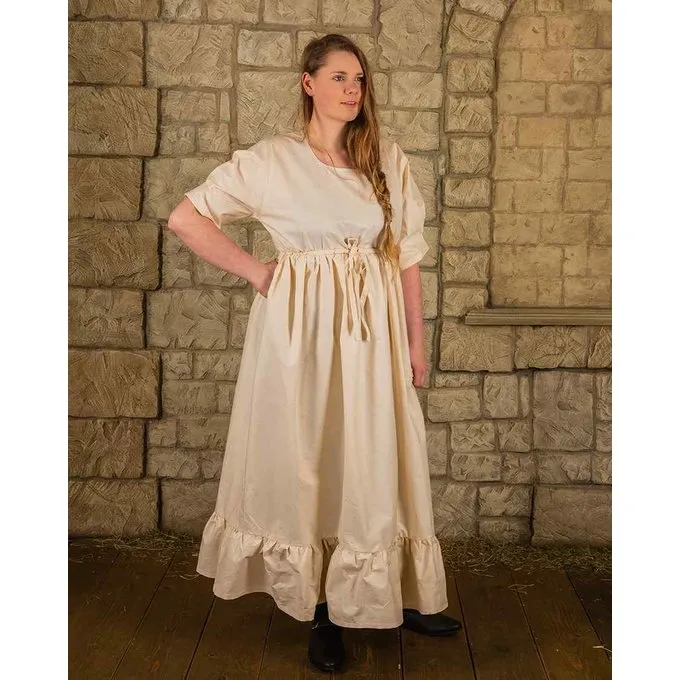 Deze onderjurk is gemaakt van een lichte maar stevige en aangenaam zachte katoenen stof, waardoor het een echte allrounder is. Het kan in veel verschillende settings worden gedragen, van eindtijd tot western tot fantasie als een nachtjapon, een lichtgewicht jurk voor vroeg-modern tot 19de eeuws. Of als onderkleding in combinatie met een verscheidenheid aan overkleding. Deze onderjurk is aangenaam luchtig en kan worden voorzien van een vetersluiting. De korte mouwen zijn versierd met meerdere figuurnaden en bieden veel bewegingsvrijheid. Wij bieden “Magdalena” aan in naturel, indien gewenst kan de stof zeer eenvoudig in de door u gewenste kleur worden geverfd met textielverf.