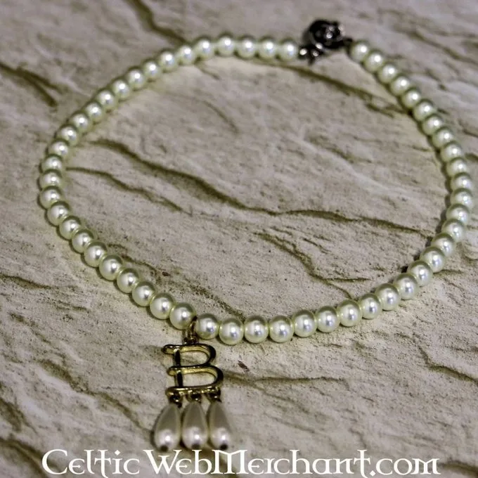 Deze parelketting is een replica van de ketting afgebeeld op Anna Boleyn’s beroemde portret die tegenwoordig te zien is in Hever Castle, Kent, Engeland. De ketting bestaat uit een rij parels met in het midden het initiaal ‘B’ met daaraan 3 parels. Anna Boleyn en haar dochter Elizabeth I droegen graag parels, zoals te zien is op verschillende portretten van deze Engelse vorstinnen. Anna Boleyn had verschillende parelkettingen met de initiaalletter B, waarvan deze ketting op verschillende portretten te zien is.