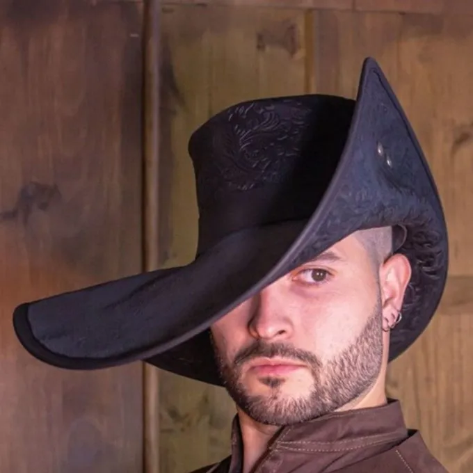 De hoeden van de Spaanse fabrikant Rawblade zijn gemaakt van hoogwaardig leer. Traditioneel vakmanschap en de hoogste kwaliteitsnormen garanderen een lange levensduur en vormvastheid. Een leren hoed is een trouwe metgezel bij slecht weer en een essentieel accessoire voor veel kostuums. Deze hoed is perfect voor musketiers kostuums. De hoed heeft een wijde rand, ideaal om je in de schaduwen te verbergen voor je vijand. Een geweldige hoed om duels mee uit te vechten.