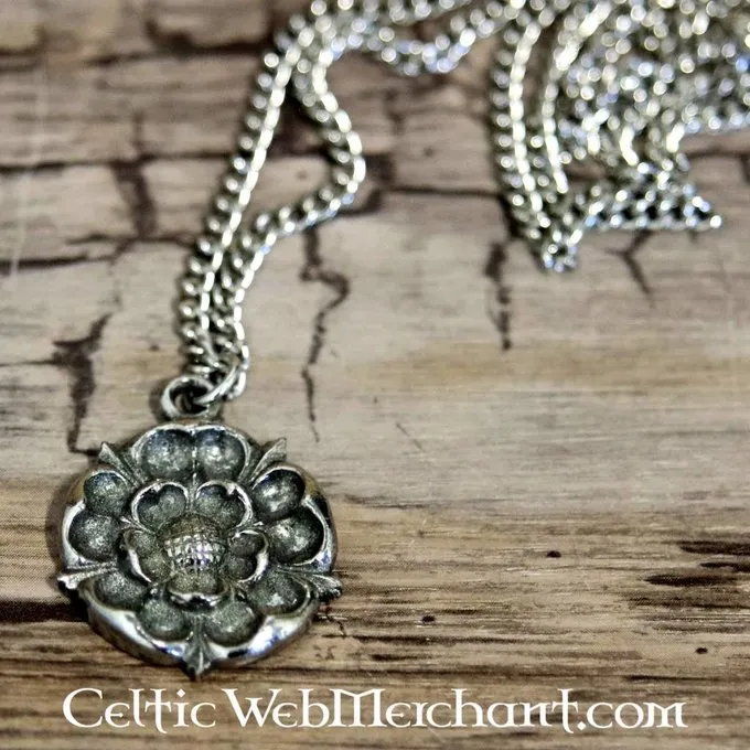 Deze hanger is gemaakt in de vorm van de roos van het huis Tudor, het koninklijk huis van Henry VIII en Elizabeth I van Engeland. Hij is gemaakt van tin en wordt inclusief zilveren ketting geleverd.
