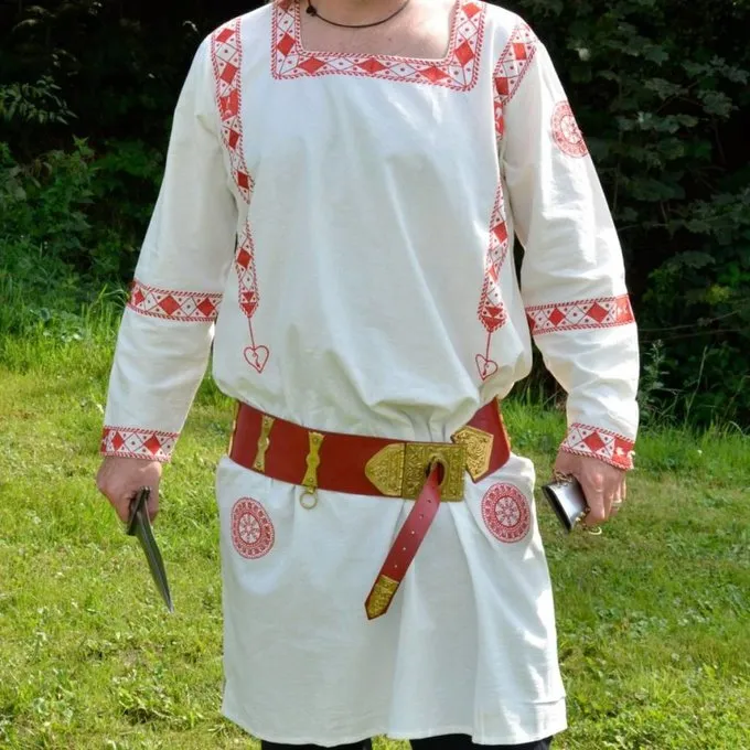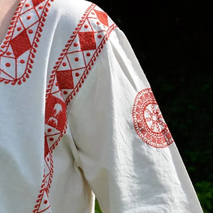 Deze tunica is van katoen gemaakt en is versierd met rood geborduurde orbicula en clavi. Hij is verkrijgbaar in maat S t/m XXL.