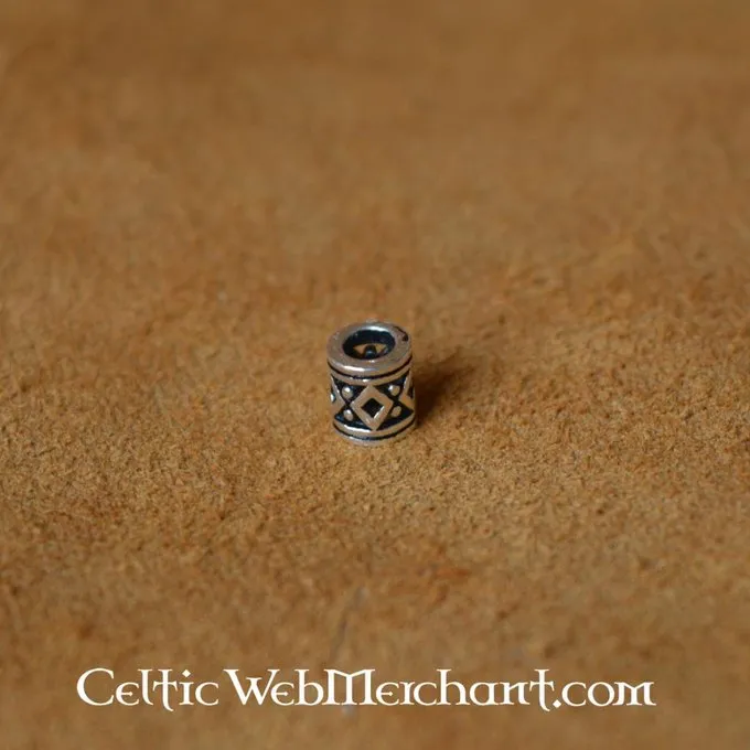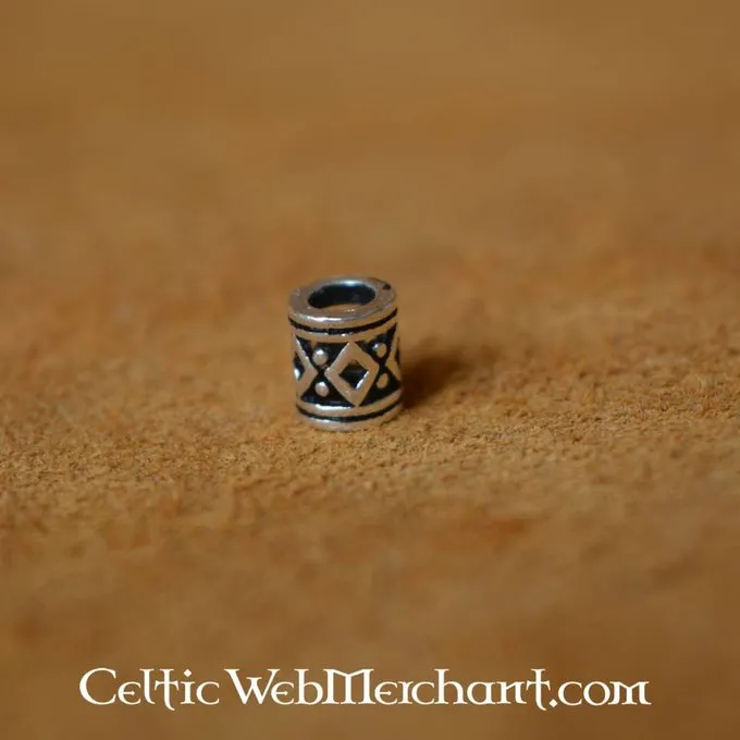 Deze kleine zilveren parel kan men gebruiken voor baard- of haarlokken of aan het eind van een vlecht. Dit ruitenpatroon was heel geliefd in de tijd van de Kelten en de Vikingen. Hij is ca. 5 x 4 x 4 mm, gemaakt van Sterlingzilver 925 en hij weegt ca. 3 gram.